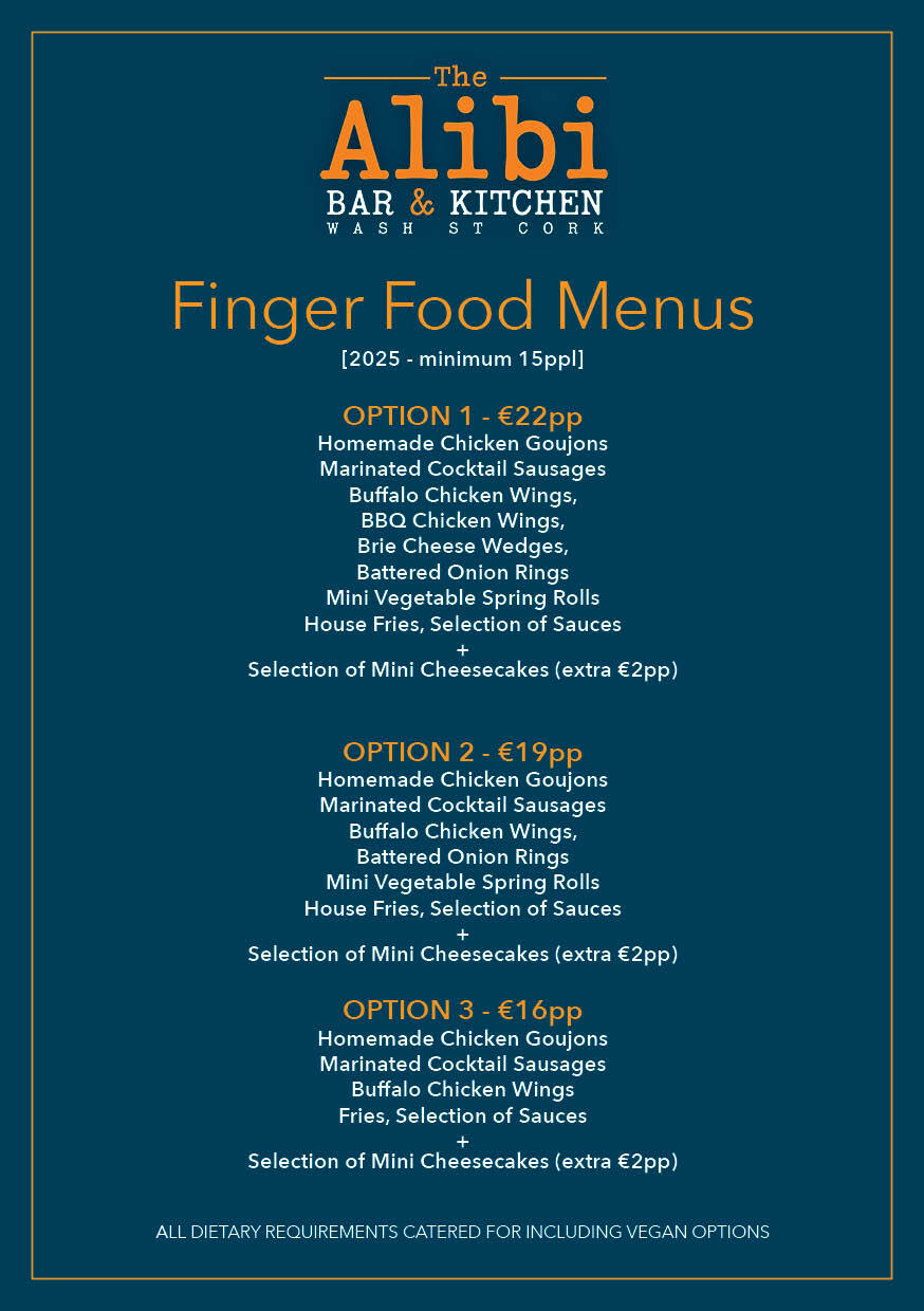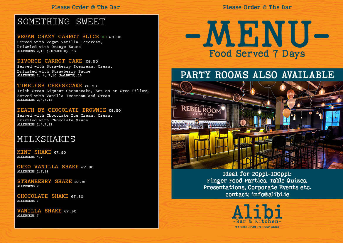 For group bookings of 10 or more please fill out his form and someone will get back to you as soon as possible. For general table bookings you can contact us on social media or email: info@alibi.ie